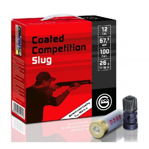 Произведен в Германии на патронном заводе "Geco". GECO Coated Competition Slug – недорогой пулевой патрон, специально созданный для стрелков-спортсменов IPSC. Благодаря короткой гильзе, увеличивается емкость подствольного трубчатого магазина (сравнительно со стандартными гильзами и «магнумами»). Тефлоновое покрытие пули уменьшает свинцовку ствола, снижет силу трения и позволяет разогнать легкий 26-ти граммовый снаряд до 450 м/с. Патрон обладает мягкой отдачей, способствующей скоростной стрельбе – важного фактора в стрельбе IPSC.