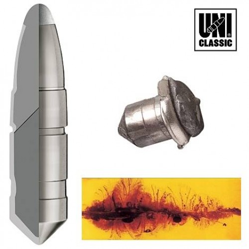 Пуля RWS UNI CLASSIC была разработана специально для охоты на крупную дичь как дополнение к пуле ID CLASSIC. Области применения: крупная и очень крупная черная и красная дичь. Более жесткий и тяжелый задний сердечник меньше подвержен грибовидной деформации, что существенно повышает пробивную способность пули. Мягкий передний сердечник из-за своей надежной фрагментации обеспечивает высокую эффективность, сравнимую с пулей ID CLASSIC. Стабильность траектории пули UNI CLASSIC достигается благодаря торпедообразной форме задней части.