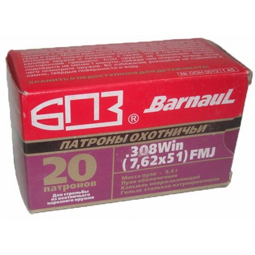 Патрон 308Win БПЗ 9,4 оцинк FMJ с оболочечной пулей для стрельбы из охотничьего нарезного оружия. Пуля со свинцовым сердечником. Капсюль "Бердан" нержавеющий. Гильза стальная оцинкованная.