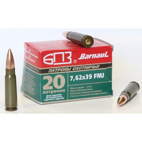 Патрон 7,62x39 БПЗ 8,0 FMJ с оболочечной пулей для стрельбы из охотничьего нарезного оружия. Пуля со свинцовым сердечником. Капсюль "Бердан" нержавеющий. Гильза стальная. Упаковка: 20 штук в пачке.