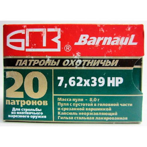 Патрон 7,62x39 БПЗ лак НР с пулей с пустотой в головной части и срезанной вершинкой для стрельбы из охотничьего нарезного оружия. Пуля со свинцовым сердечником. Капсюль "Бердан" нержавеющий. Гильза стальная лакированная. Упаковка: 20 штук в пачке.