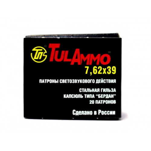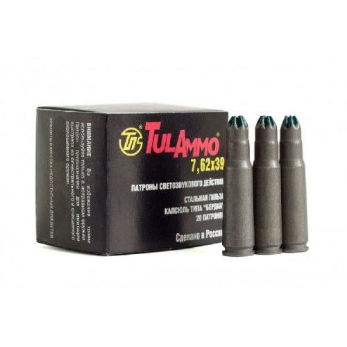 Патроны светозвукового действия калибра 7,62х39(шумовые) изготовлены Тульским Патронным Заводом. Предназначены для учебной стрельбы из списанного охолощённого оружия под данный калибр, например, АКМ (ВПО-925), АКМ-СХ, АК-103, АКМС-СХ, РПК (ВПО-926), СКС (ВПО-927), РПД-44 (РПДХ) и другого. Патрон не является боеприпасом, так как не содержит поражающих элементов и при использовании имитирует звук выстрела. Может использоваться для подачи сигналов из спортивно-охотничьего оружия.