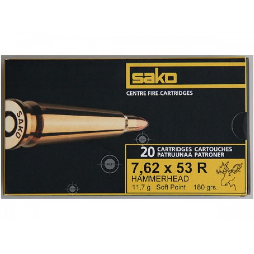 Патрон 7,62x53R Sako 11,7 Hammerhead SP c тупоконечной тяжёлой пулей с оголённым сердечником, разработан специально для охоты на крупных животных: лося и оленя и т.д. Sako Hammerhead - тяжелая, омедненая полуоболочечная пуля, для более крупных калибров. Специально разработанная форма и конструкция предотвращает фрагментацию пули, сочетает контролируемую грибовидную деформацию и отличную останавливающую силу. Пуля очень эффективна для охоты на крупную дичь на коротких и средних дистанциях. Патрон может применяться не только с карабинами Sako, но и с оружием соответствующего калибра любой другой фирмы.