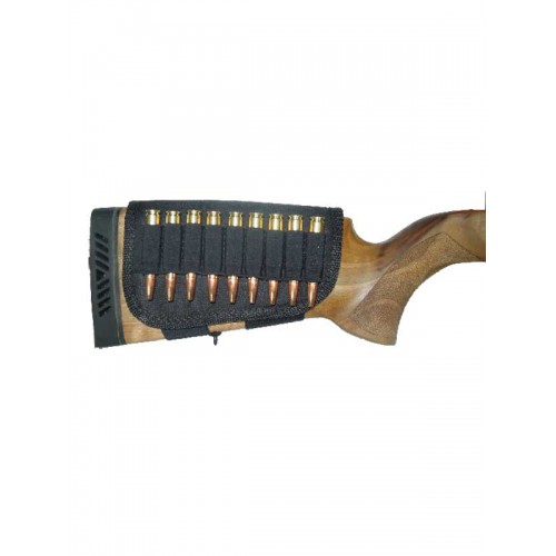 Открытый патронташ на 9 патронов к нарезному оружию калибра 7,62 мм. Изготовлен из прочного синтетического материала, долговечного в эксплуатации и легкого в уходе. Крепится на прикладе при помощи резины и ленты «велкро», гнезда под патроны из прочной резины.