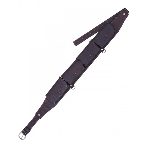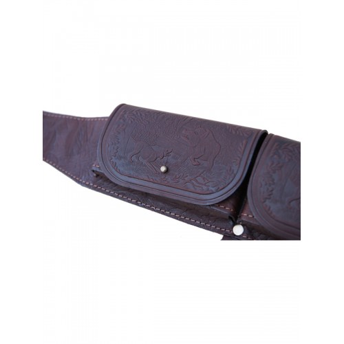 Изготовлен в традиционной форме из натуральной кожи. Патронташ надежно держит 24 патрона в лузах. Позволяет загрузить патроны снаряженные в гильзы длиной от 70 мм до 89 мм. Оснащен клапанами для защиты патронов от не погоды. В производстве используется итальянская фурнитура, которая практически не дает бликов. Раскрой производится на специальном оборудовании, что гарантирует высокое качество. Изделие украшено миниатюрами охотничьей тематики, нанесенными методом горячего тиснения.