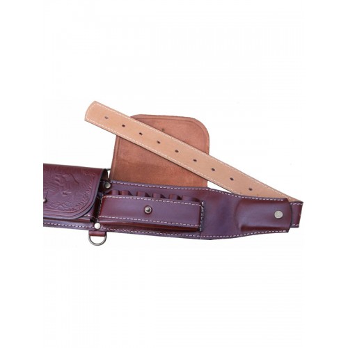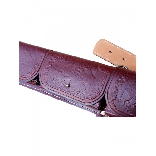 Изготовлен в традиционной форме из натуральной кожи. Патронташ надежно держит 24 патронов в лузах. Позволяет загрузить патроны снаряженные в гильзы длиной от 70 мм до 89 мм. Оснащен клапанами для защиты патронов от не погоды. В производстве используется итальянская фурнитура, которая практически не дает бликов. Раскрой производится на специальном оборудовании, что гарантирует высокое качество. Изделие украшено миниатюрами охотничьей тематики, нанесенными методом горячего тиснения.