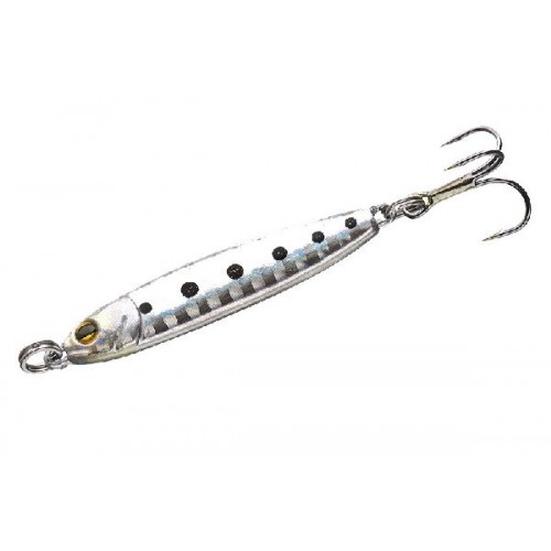 Это классический пилькер, имеющий с виду незамысловатое тело, две петли для привязывания и крючка и качественную покраску с голограммой, но вы удивитесь на что способна эта брусковатая приманка.