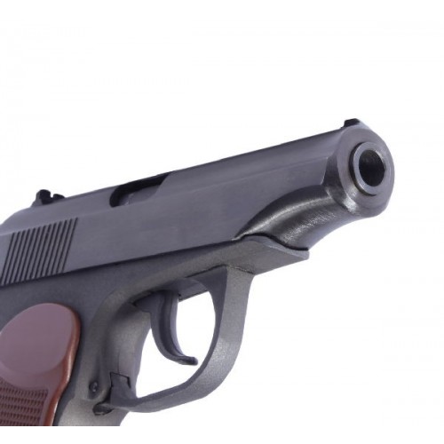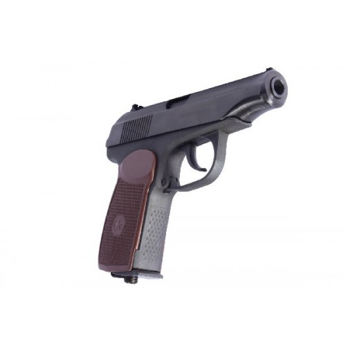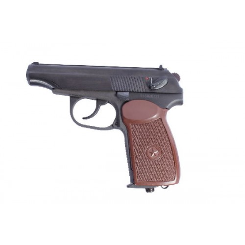 Популярный газобаллонный аналог пистолета Макарова. Идеальный вариант для развлекательной стрельбы и получения первоначальных навыков обращения с оружием. Внешний вид оружия, механическая прочность, надежность конструкции, удобство в применении, качество изготовления и сборки всех деталей и узлов оружия идентичны ПМ. Ударно-спусковой механизм пистолета позволяет вести стрельбу как самовзводом, так и с предварительным взведением курка. При постановке оружия на предохранитель при взведенном курке происходит безопасный спуск курка, аналогично прототипу. Стреляющее устройство - магазин, клапан и баллончик с углекислотой образует единый отдельный блок, который вставляется в рукоятку, аналогично настоящему магазину. Для стрельбы используются стальные сферические пули. Источник энергии выстрела - 7 или 12 г баллончики с СО2.