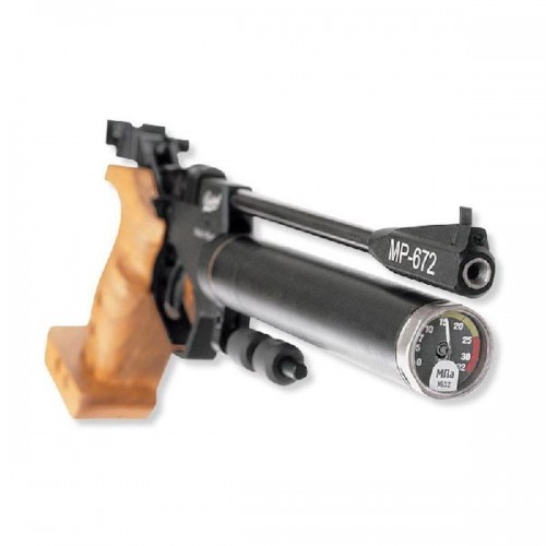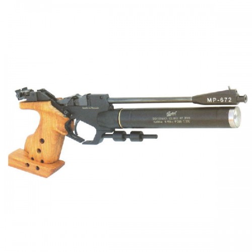 Общая длина пистолета МР 672 составляет 420 мм, при этом его масса составляет 1.3 кг. Рукоять изготовлена из древесины твердых пород, очень эргономична, что вполне ожидаемо для спортивного пистолета. Имеется регулируемый упор.