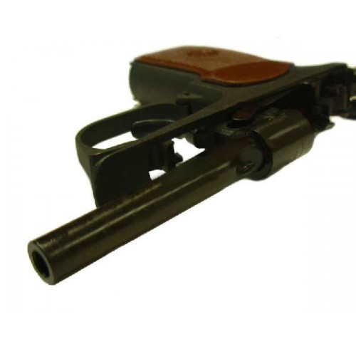 Работа автоматики основана на принципе отдачи свободного затвора. Автоматический цикл включает в себя экстракцию и отражение гильзы после выстрела, взведение ударно-спускового механизма и досылание очередного патрона из магазина в патронник. Поскольку энергия, развиваемая холостым и газовым патронами значительно меньше энергии, развиваемой патроном с резиновой пулей, данный травматический пистолет Макарова 9 мм, работает в режиме автоматического перезаряжания только на патроне с резиновой пулей. При стрельбе газовыми и холостыми патронами для перезаряжания пистолета необходимо после каждого выстрела рукой отводить затвор в крайнее заднее положение, после чего затвор под действием возвратной пружины досылает патрон в патронник. Благодаря наличию в пистолете самовзводного ударно-спускового механизма куркового типа можно открывать огонь без предварительного взведения курка. По израсходовании всех патронов из магазина затвор пистолета мр 79 9тм становится на затворную задержку и остается в заднем положении. Безопасность обращения обеспечивается надежно действующим предохранителем. Пистолет имеет флажковый предохранитель, расположенный на левой стороне затвора. При переводе предохранителя в положение предохранение (красная точка на затворе перекрывается предохранителем) осуществляется спуск курка с боевого взвода с одновременным перехватом курка блокирующим выступом предохранителя. В этом положении обеспечивается невозможность удара курком по ударнику и отведения затвора назад. Происходит блокировка затвора.