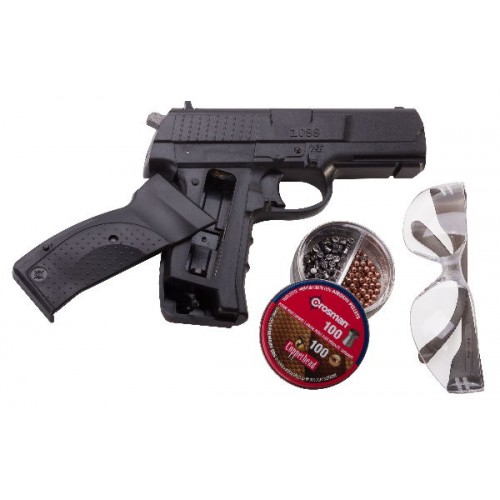В комплекте с пистолетом идут очки для стрельбы, 100 свинцовых пуль и 100 шариков. На затворной рамке, снизу выполнены направляющие для установки лазерного целеуказателя или тактического фонаря.