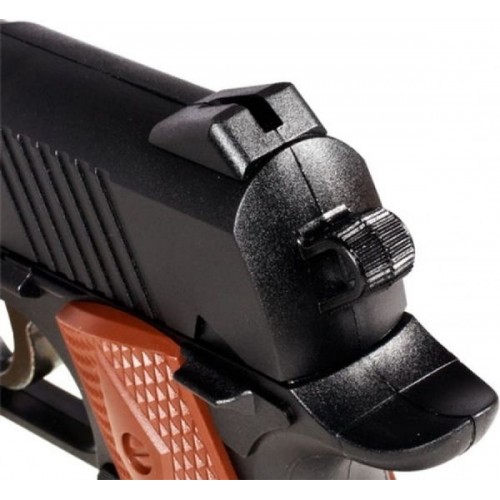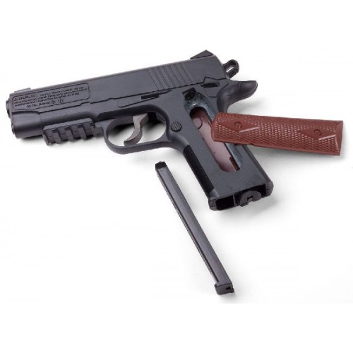 Газобаллонный пневматический пистолет Crosman PR077CS предназначен для спортивной и развлекательной стрельбы на средних и малых дистанциях. Внешне Crosman PR077CS подобен боевым пистолетам, однако по сравнению с ними он компактнее и легче. Модель снабжена достаточно вместительным магазином, рассчитанным на 17 сферических пуль. Одна из главных особенностей пистолета – уникальная скорострельность: производить выстрелы можно настолько быстро, насколько вы успеваете нажимать на курок. Crosman PR077CS снабжен системой имитации отката затвора «блоубэк». Под стволом расположена база, предназначенная для крепления различных аксессуаров (лазерного целеуказателя, фонаря и т.д.).