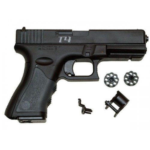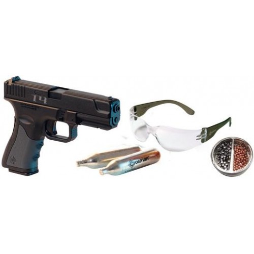 Crosman Т4 Kit - набор, состоящий из пневматического пистолета Crosman T4CS, очков для стрельбы, набора мишеней и свинцовых пулек и шариков BB. Пневматический пистолет Crosman T4CS — очень интересная и хорошо проработанная модель. Это газобаллонный полуавтоматический пистолет, способный стрелять стальными шариками и свинцовыми пулями калибра 4,5 миллиметра. Внешне пистолет напоминает Glok, хотя и не является его точной копией. Магазин вмещает 8 пуль.