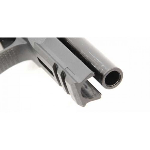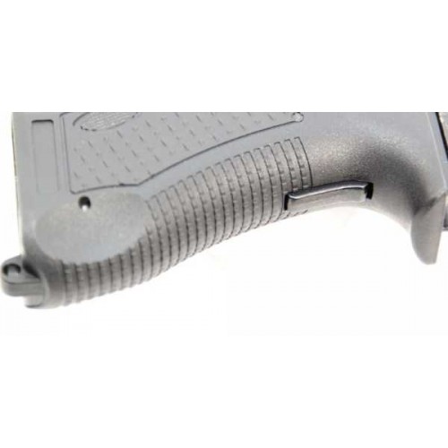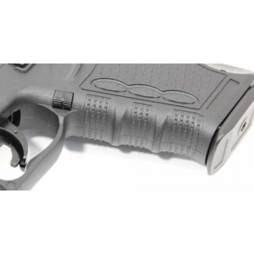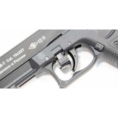 Травматический пистолет оснащен тремя автоматическими предохранителями. Разборка пистолета аналогично боевому прототипу. Затвор изготовлен из сплава ЦАМ, рамка - из пластика. В канале ствола травматический расположены четыре преграды, цель которых - не допустить стрельбу твердой пулей и снизить ее начальную скорость. Работа автоматики основана на принципе отдачи свободного затвора. Ударно-спусковой механизм - двойного действия УСМ ДД , допускает ведение огня как самовзводом, так и с предварительно взведенного курка. Неавтоматический флажковый предохранитель Флажковый предохранитель располагается по обеим сторонам затвора. Рычаг затворной задержки и кнопка извлечения магазина находятся с левой стороны рамки. Там же располагается рычажок для разборки оружия. Пистолет оснащен планкой Picatinny для установки разнообразных аксессуаров.