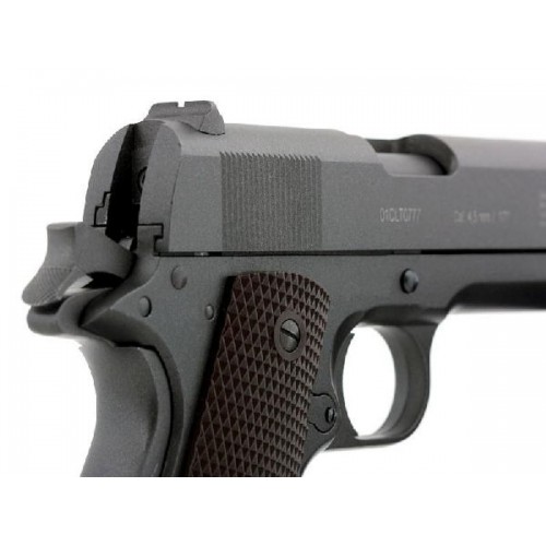 Пистолет CLT 1911 стреляет 4,5 мм омедненными или стальными шариками и работает на энергии сжатого углекислого газа СО2. Модель оснащена системой "блоубэк", обеспечивающей откат подвижной затворной рамы при выстреле и имитирующей стрельбу из боевого пистолета. Дульный срез ствола имитирует оригинальный боевой калибр.