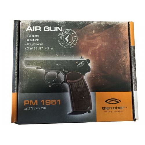 Gletcher PM 1951 - газобаллонная версия знаменитого пистолета Макарова. В отличие от большинства аналогов, корпус этой модели целиком сделан из металла. Компоновка - стандартная для CO2. Стреляет самовзводом, в качестве боеприпасов используются шарики ВВ. Пневматический пистолет с начальной скоростью вылета пули - 100 м/с. Калибр - 4,5 мм, вместимость магазина изделия - 16 шариков ВВ. Дульная энергия - не более 3 Дж. Оснащен системой возврата механизма затворной рамы blowback.