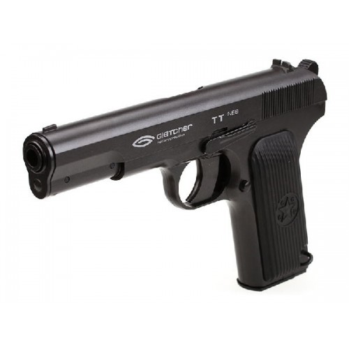 Пневматический пистолет Gletcher TT NBB - это газобаллонная пневматика именитого производителя пневматического оружия Gletcher. Дизайн пистолета полностью повторяет дизайн пистолетов ТТ (Тульский Токарева) послевоенного образца, который состоял на вооружении у нас в стране вплоть до 2000-х годов, а в некоторых странах используется войсками и спецподразделениями и по сей день. Пистолет имеет металлический корпус и весит 600гр. Ударно спусковой механизм пистолета двойного действия. Прицельные приспособления открытые - целик и мушка. Затворная рама при стрельбе не двигается отсутствует функция Blowback. Оригинальная модель славится своей простотой и надежностью в эксплуатации, именно этот принцип и был положен в основу конструкции пневматического «собрата». Отличием пневматического ТТ от оригинала являются утолщенные пластиковые накладки на рукоять, сделано это для большего комфорта. Действительно, и это скажет каждый понимающий в оружие человек. С учетом высоких стрелковых характеристик и доступной цены это делает Gletcher TT NBB отличным вариантом оружия для начинающих стрелков. В качестве пуль для пистолета используются стандартные стальные шарики диаметром 4,5 мм. В магазине помещается 18 таких пуль. Стрельба возможна как самовзводом, так и в режиме предварительного взвода затвора. Прицельная дальность стрельбы составляет около 15 метров, а начальная скорость пули – 125 м/с. В качестве источника энергии для выстрела применяется стандартный баллончик с углекислым газом 12 грамм.