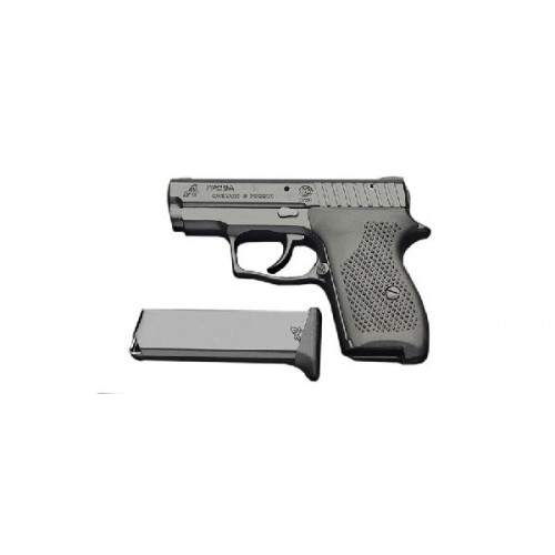 Пистолет полностью сделан из стали, из пластика выполнены только накладки рукояти и пятка магазина. Затвор имеет насечку для удобства перезарядки.