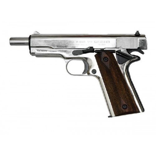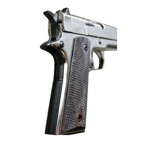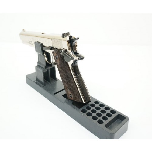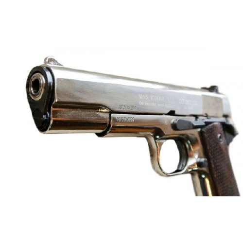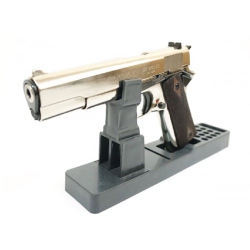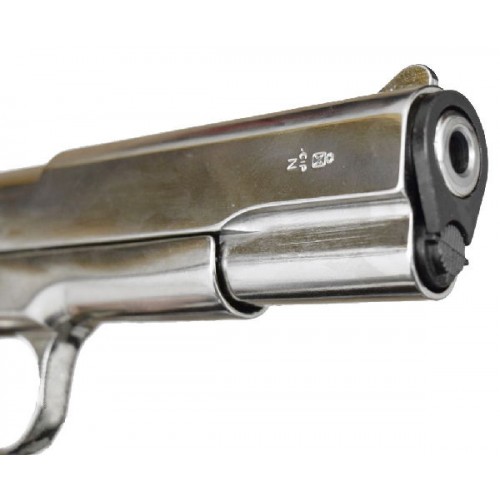 Пистолет Курс-С Colt 1911 СО – это копия легендарного Colt 1911A1.Основное конструктивное отличие состоит в отсутствии автоматического предохранителя на тыльной стороне рукоятки. Но на правой стороне установлен флажковый предохранитель. УСМ С Colt 1911 СО одиночного действия, стрельба имитируется в полуавтоматическом режиме, в процессе выстрела затвор сдвигается, спуск взводится и боеприпас поступает в патронник. Корпус изготовлен из специального сплава Zamak , который является легким и прочным материалом, отлично подходящим для изготовления оружия любого назначения. Вес пистолета, при этом, всего около 980 гр. Это полное соответствие по весу боевой модели. Как и оригинал, рукоятка С Colt 1911 СО оснащена деревянными накладками с противоскользящим рисунком, который предотвращает выскальзывание пистолета из рук. Пистолет можно использовать для имитации выстрела, который очень реалистичен. Из ствола выбрасывается пламя и газы и происходит характерный хлопок. Также, для максимальной достоверности, пистолет оснащен системой Blowback ,точно имитирующей отдачу, как при стрельбе из настоящего оружия. Магазин пистолета вмещает 7 патронов, что вполне достаточно для эфффектной демонстрации знаменитого детища Джона Мозеса Браунинга.