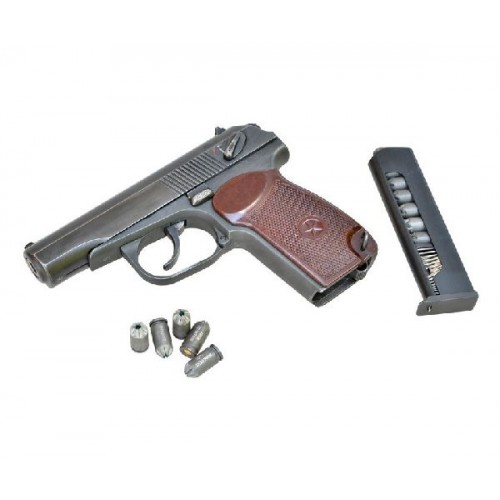 Магазин коробчатый, однорядный вместимостью 7 патронов. При израсходовании всех патронов магазина затвор останавливается в заднем положении на затворной задержке. Прицел постоянный с пеньковой мушкой и щелевым целиком. На пистолет установлена бакелитовая рукоять, поэтому он смотрится довольно солидно, и с виду практически не отличается от настоящего боевого ПМ.