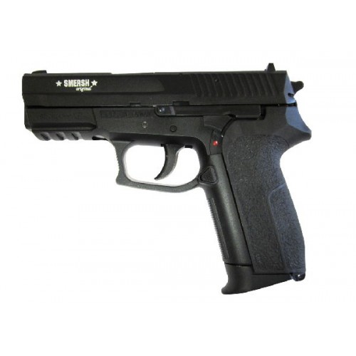 Smersh H57 - пневматический аналог боевого пистолета SIG SAUER SP 2022. Отличное сочетание безопасности, надежности, точности стрельбы, простоты в обращении и долгой службы. Рамка Smersh H57 выполнена из пластика, затвор и магазин - из металла. Скорость выстрела составляет ~ 120-140 м/с.
