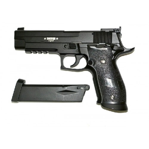 Пневматический пистолет Smersh H63 4,5 мм - газобаллонный пистолет внешне копирующий Sig Sauer P226 X-Five Tactical. Эргономичный каркас пистолета цельнометаллический. Энергия пули для Smersh H63 достигает 3 Дж. Обладая прицельной дальностью в 10 метров при начальной скорости заряда в 120 м/с, он отлично подойдет для развития своих профессиональных способностей. Полноразмерный магазин вмещает в себя 19 ВВ кал. 4,5 мм. Пистолет весит 1250 г.,длина его составляет 255 мм. Любителей пневматики порадует и наличие подвижной затворной рамы, что придает стрельбе большую реалистичность.