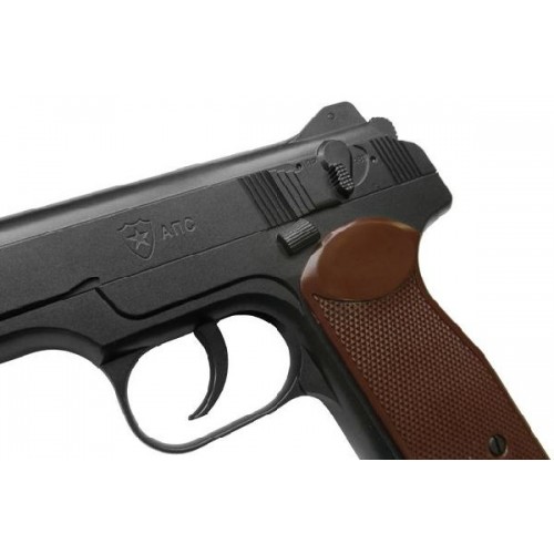 Магазин извлекается нажатием на кнопку на пятке рукоятки. Рядом находится поджимной винт для закрутки баллончика. Для установки баллона снимается левая накладка на рукоять. Накладки на рукоятку сделаны из пластика коричневого цвета. Пистолет стреляет стальными шариками. Обойма вмещает 19 сферических пуль. Модель стреляет только самовзводом. Скорость пули на уровне 125 м/сек. Umarex АПС – крупный пистолет, для стрелков, предпочитающих увесистые металлические модели.