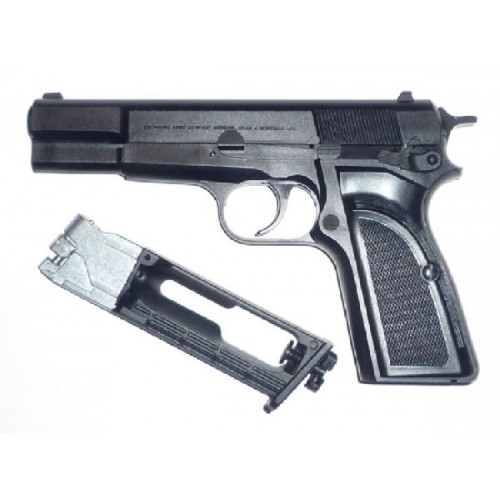 Пневматический вариант Browning High Power Mark III относится к числу сравнительно недорогих моделей. Пистолет сделан из ударопрочного пластика и весит всего 386 грамм. Несмотря на легкость пистолета, он хорошо сбалансирован. К тому же у пистолета удобная рукоятка, с выемками под пальцы в верхней части накладок. Поэтому пистолет комфортно лежит в ладони: причем одинаково удобно как в левой, так и правой руке. Использованию пистолета левшами способствует также двухсторонний предохранитель. Рычаг предохранителя расположен над рукояткой с обеих сторон рамки пистолета, поэтому легко переключается большим пальцем любой руки.