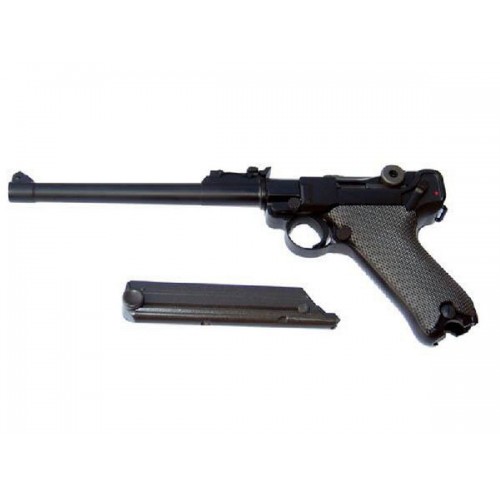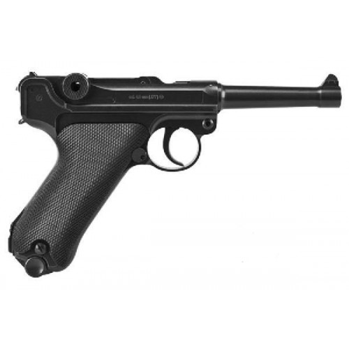 Пистолет Umarex P.08 Люгер представляет собой отличную пневматическую модель легендарного немецкого пистолета времён Великой отечественной войны – Luger Parabellum. Этот пистолет отличает высокая точность стрельбы, достигнутая за счёт удобной «анатомической» рукояти с большим углом наклона и легкого (почти спортивного) спуска. Ещё одно преимущество модели – большая ёмкость магазина – 21 пуля. Полностью металлический (за исключением накладки рукоятки – она из пластика), монолитный (неподвижный затвор). Дальность стрельбы – 300 метров. Вес идентичен оригиналу. Габариты идентичны оригиналу. Стандартный бытовой баллон CO2 помещается в рукояти магазина и прячется под пластиковой накладкой.