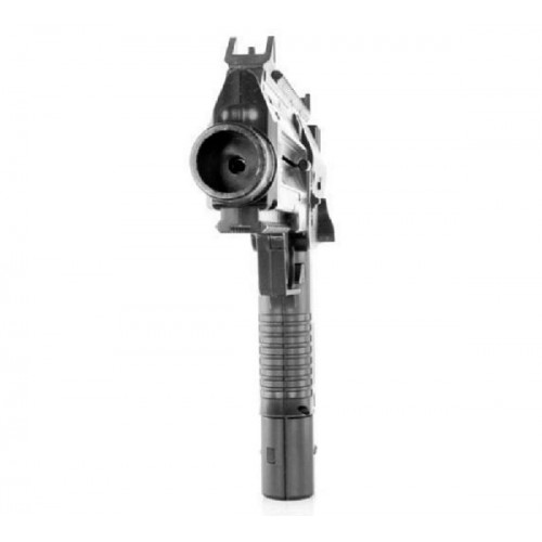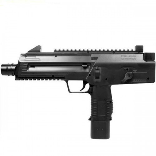 Пневматический пистолет Umarex Steel Storm black по внешнему виду подобен знаменитому МП-7. Выглядит очень естественно и дает ощущение владения настоящим боевым оружием. Эргономичная рукоятка позволяет удобно удерживать пистолет в руке. Ствол выполнен из металла, а корпус изготовлен из пластика высокого качества. Ствол - стальной, гладкий. Для стрельбы использует два баллончика СО2, вставляющиеся в рукоять (хватает примерно на 200 выстрелов). Стрельба ведётся как одиночными выстрелами, так и очередями по шесть шариков за выстрел. В качестве прицельных приспособлений используются прицельная планка и мушка. Есть возможность установить лазерный целеуказатель на планки Weaver, расположенные сверху и снизу на цевье. Предохранитель - "бегунок", переключение огня флажковый. Перед первым выстрелом необходимо оттянуть затвор назад. В магазин устанавливаются параллельно два баллона СО2 12г. Баллончики поджимаются ключом-шестигранником (входит в комплект). Вместимость пружинного магазина - 30 шариков. В верхней левой части корпуса расположен встроенный зарядник для магазина вместимостью 300 шариков.