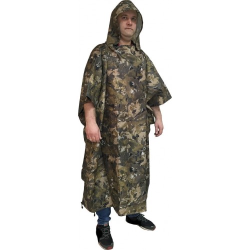 Облегченный плащ- накидка для защиты от ветра, грязи и влажности. Плащ представляет собой накидку с капюшоном, застегивающуюся на кнопки по боковым швам, в верхней части которых расположены прорези для рук. Объём регулируется по низу накидки и краю капюшона. Навесной карман-сумку на спине можно использовать, как карман и, как мешок для упаковки накидки.