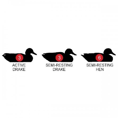 | Комплектация: | 12 чучел в 3х позах: активный селезень - 3 шт; полу-отдыхающий селезень - 3 шт; полу-отдыхающая самка - 6 шт |