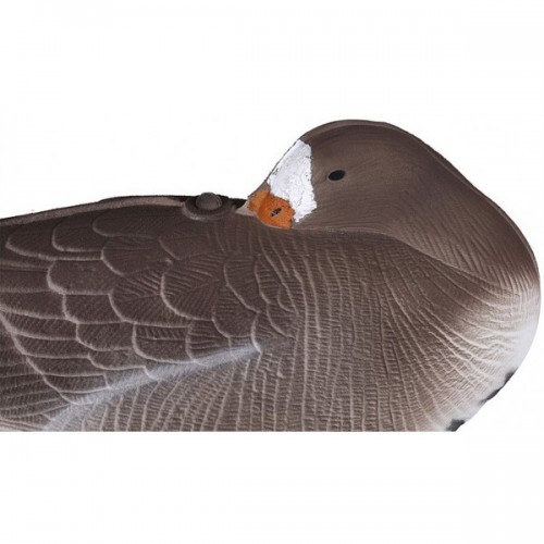 Флоковое покрытие [Живое перо] (бархатистая, мягкая на ощупь поверхность), имитирующая перо гуся, вместе со специальными красками создает реалистичное свечение чучела в ультрафиолетовом излучении, а также поглощает большое количество солнечных лучей, абсолютно предотвращая бликование на солнце. Усиливающие кольца в районе брюха и на спине чучела увеличивают срок службы изделия, предотвращая механические повреждения шва чучалки.