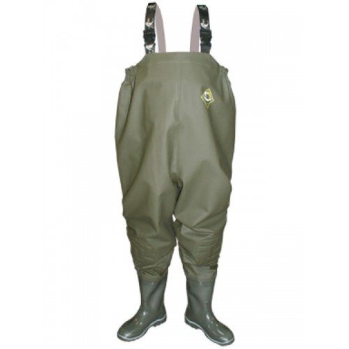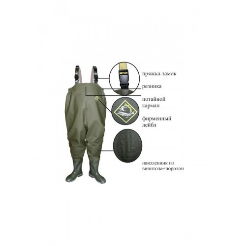 Полукомбинезон предназначен для создания безопасных и комфортных условий во время рыбалки и охоты. Выполнен специальным кроем и подходит для полных людей. Для более хорошего прилегания к фигуре по бокам верхнего края полукомбинезона проложен резиновый жгут. Сапог выполнен с применением технологии трехкомпонентного литья. Подошва устойчива к истиранию за счет добавления каучуковых компонентов в композиции ПВХ. Обладает упругостью, холодоустойчивостью и высокими амортизирующими свойствами, благодаря прослойке из вспененного нитрильного каучука. Все швы полукомбинезона соединены с использованием особой технологии пайки, что помогло добиться лучшей прочности и герметичности.
