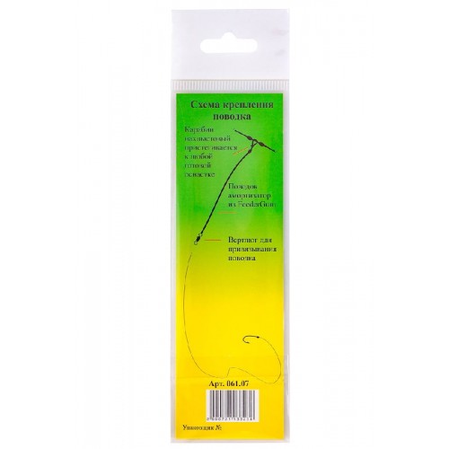 Поводок имеет с одной стороны нахлыстовую застежку для быстрой смены поводка. Просто пристегните его к основе между 2-х силиконовых стопоров или узелков. К вертлюгу № 14 привяжите поводочную леску нужного вам диаметра. В данных условиях крючок подбирается в зависимости от используемой насадки.
