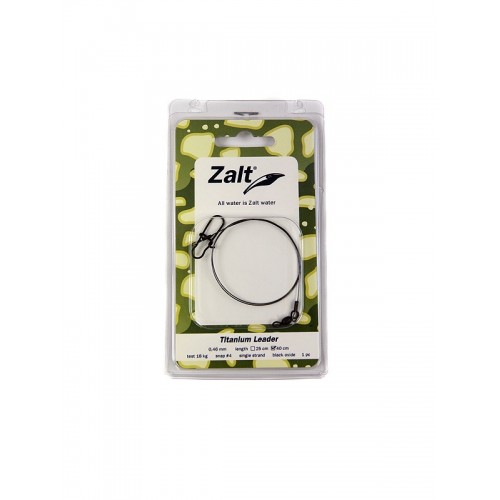 Поводки Zalt Titanium изготовлены из уникального материала, который практически невозможно деформировать, как при забросе, так и во время проводки приманки на захламленных участках водоемов. Применяемый материал не имеет «памяти» и в большинстве случаев принимает первоначальную форму. Основная сфера их применения - это ловля на крупные воблеры и джеркбейты.