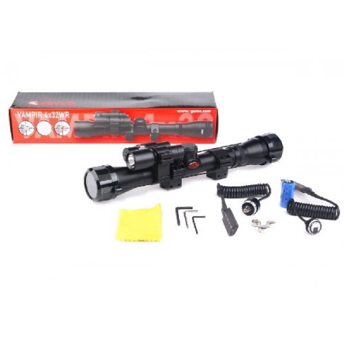 Надежный оптический прицел для любых погодных условий Gamo 4х32 WR Vampir способен работать в самых сложных ситуациях. Классический корпус и небольшая масса прибора сделали его весьма популярным среди спортсменов и охотников. Оптика прицела модели 4x32 WR Vampir включает в себя объектив с просветленными линзами 32 мм диаметра. Прибор, рассчитанный на работу на средних и ближних дистанциях, уверенно обеспечивает хорошее детализированное изображение, невзирая на условия освещенности. Высокое качество стекла и просветляющий состав на нем дополняются защитой от истирания, серьезно увеличивающей срок безотказной службы устройства. Точность наводки обусловлена наличием визирной сетки Duplex, позволяющей точно вычислять расстояние и размеры объекта. Выверка прицела производится с шагом 0.25 МОА. Среди дополнительных опций следует отметить наличие крепления для фонаря, сам фонарь и вынесенную кнопку его включения; ЛЦУ, которая также имеет вынесенную кнопку; планку крепления к оружию типа «ласточкин хвост». Значительное удаление выходного зрачка от глаза предохраняет охотника от случайных травм при выстреле. Прочный корпус из алюминия представляет собой цельную трубку, заполненную азотом, что позволяет избежать запотевания оптики. Это дает возможность использовать устройство в любом климате и при ненастной погоде. Длина прицела составляет 303 мм.