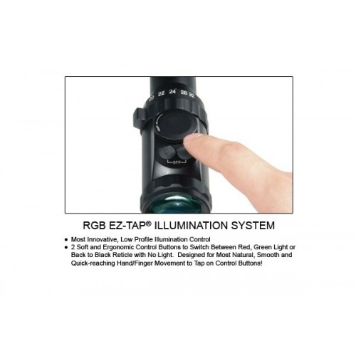 Leapers Accushot Tactical 1.5-6x44 включается нажатием кнопки R (красный) или G (зеленый). Для выключения нужно зажать любую из них на одну секунду.