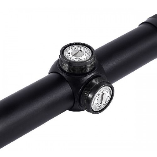 Прицел имеет два барабанчика для ввода поправок по горизонтали и вертикали, кольцо регулировки кратности располагается на стыке трубы и объектива. Имеется кольцо фокусировки.