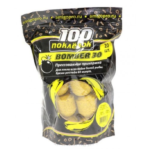 100 Поклёвок Bomber-30 - это прикормочный микс, спрессованный под сильным давлением на специальном оборудовании. В состав прикормочных шаров входят проверенные временем, натуральные и эффективные компоненты - кондитерские бисквиты, пшеничные и ржаные сухари, измельченные злаки и натуральные ароматизаторы. Прикормочные шары имеют одинаковую массу и размер - около 30 миллиметров, что является важным фактором при прикармливании определенной зоны лова. Bomber имеют очень плотную структуру. Это особенность позволяет без труда забрасывать шары в точку лова с помощью рогатки-катапульты или “кобры”, не переживая что шар развалиться, не достигнув прикармливаемой зоны. Попадая в воду, спрессованная смесь начинает активно и достаточно быстро распадаться. Полностью прикормочные шары Bomber распадаются около часа. В процессе они образуют на дне ароматное питательное облако с поднимающимися в верх кормовыми частичками, что очень эффективно привлекает рыбу к месту лова. Одна упаковка таких прикормочных шаров способна заменить около двух килограммов обычного, рассыпчатого микса.