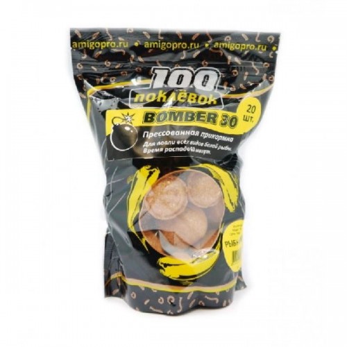 100 Поклёвок Bomber-30 - это прикормочный микс, спрессованный под сильным давлением на специальном оборудовании. В состав прикормочных шаров входят проверенные временем, натуральные и эффективные компоненты - кондитерские бисквиты, пшеничные и ржаные сухари, измельченные злаки и натуральные ароматизаторы. Прикормочные шары имеют одинаковую массу и размер - около 30 миллиметров, что является важным фактором при прикармливании определенной зоны лова. Bomber имеют очень плотную структуру. Это особенность позволяет без труда забрасывать шары в точку лова с помощью рогатки-катапульты или “кобры”, не переживая что шар развалиться, не достигнув прикармливаемой зоны. Попадая в воду, спрессованная смесь начинает активно и достаточно быстро распадаться. Полностью прикормочные шары Bomber распадаются около часа. В процессе они образуют на дне ароматное питательное облако с поднимающимися в верх кормовыми частичками, что очень эффективно привлекает рыбу к месту лова. Одна упаковка таких прикормочных шаров способна заменить около двух килограммов обычного, рассыпчатого микса.