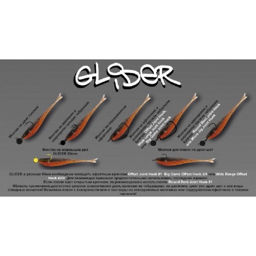 Оригинальная форма эффективно работает как в «обыденном» джиге, так и во всевозможных разнесенных оснастках: джиг-риге, отводном, техасе, дроп-шоте. В воде Glider напоминает подраненного малька, соблазняя этим хищника. Рыская в воде, приманка провоцирует даже пассивных хищников нападать, часто делая результат рыбалки.