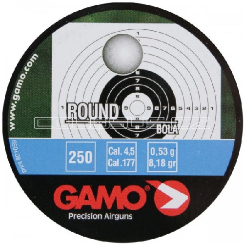 Пульки Gamo Round 0,53 г, 250 шт., калибр - 4,5 мм. Отличаются от шариков ВВ тем, что изготавливаются не из стали, а из свинца. Обладают замечательной пробивной способностью. Свинцовые круглые пули во время выстрела хорошо раскручиваются нарезами, а это улучшает их аэродинамичные свойства. Точность и кучность стрельбы пулями Round в несколько раз превышает показатели для ВВ.