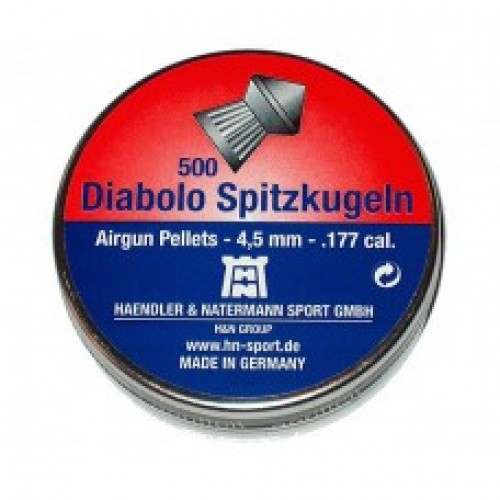 Пульки H&N Diabolo Spritzkugeln 500 шт., калибр 4,5 мм, вес 0,56 г. Высокоточные, остроконечные, рифленые, для средних дистанций. Аэродинамический дизайн для настильной траектории полета и высокой пробиваемости.