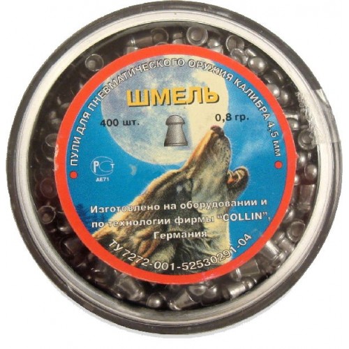 Калибр 4,5 мм (Cal. 4.5 mm, Cal .177) Материал свинец. Вес пульки приблизительно 0,8 г (12,34 gr). Пули шмель 4 5 мм продаются по 400 штук. Лучше всего пневматические пули Шмель 4.5 мм подходят для использования в оружии с высокой дульной энергией (например, МР-512), так как из-за толстых стенок пули шмель 0.8 испытывают большое сопротивление движению по каналу ствола (проще говоря, туго проходят по стволу) и не развивают достаточную скорость в относительно маломощных образцах винтовок (ИЖ-38, ИЖ-61, ИЖ-53 и т. п.).