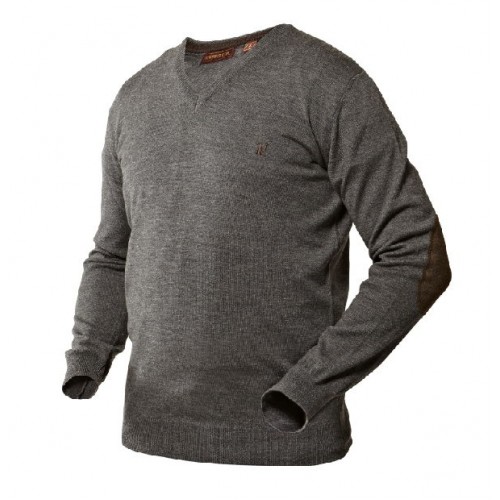 Стильный мужской пуловер Harkila Jari flint grey melange серого цвета из ультратонкой шерсти. Легкий и теплый, приятный на ощупь. V-образный вырез. Зона локтей со специальной уплотненной отделкой.