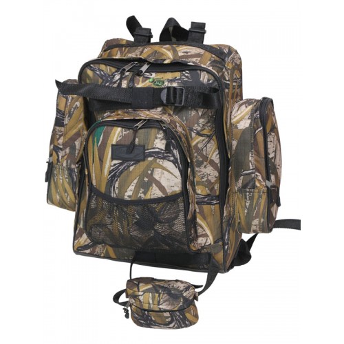 Ранец для охотника с фронтальным клапаном и четырьмя боковыми карманами, застегивающимися на молнию. Ранец оснащен поясным ремнем, позволяющим разгрузить спину при переноске тяжелого груза. На поясном ремне предусмотрен карман для навигатора или телефона. Съемные ремни позволяют прикрепить к ранцу дополнительное снаряжение.