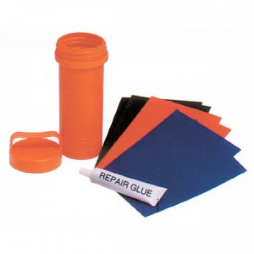 Предназначен для ремонта лодки в походных условиях. В пластиковом контейнере с крышкой находятся несколько кусочков материала серого и темно-серого цвета и тюбик однокомпонентного клея объемом 30 мл.