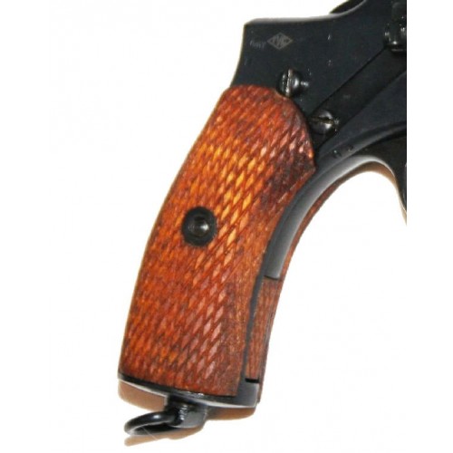 Охолощенный револьвер выполнен в черном цвете, с накладками из дерева на рукояти.