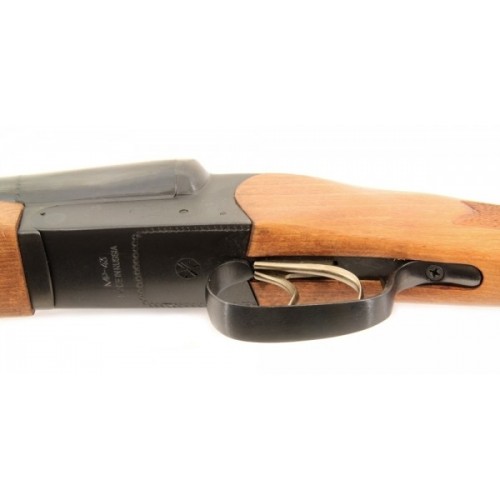 Гладкоствольное ружье МР 43 Е - модификация базовой модели с эжектором селективного типа, выбрасывающим только одну стреляную гильзу. Ружье обладает хорошим балансом, обеспечивающим удобное и быстрое прицеливание. Классическая конструкция затвора с запиранием на два подствольных крюка. Для защиты от коррозии каналы и патроны хромируются. Ружье производится с фиксированными дульными сужениями, обеспечивающими стабильную кучность стрельбы. Цевье и приклад изготовлены из бука.